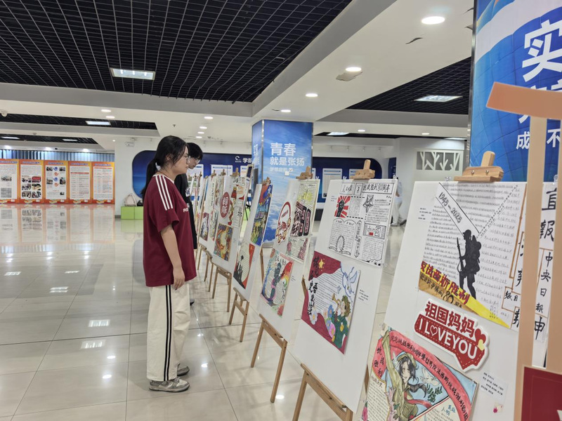 此次作品展全方位呈现了本校学生在2025年春季学期《习近平新时代中国特色社会主义思想概论》与《中国共产党党史》两门课程实践教学中的优秀成果。依据活动方案,经学生小组汇报、任课教师初步评审、学院评审组复核评审,最终从1000余份作品中评选出60幅优秀手抄报作品,其中24幅作品进行了现场展示。同学们以笔为旗帜、以纸为战鼓,精心设计版面,内容丰富且详实。通过亲手绘制的图画、摘录的历史图片以及饱含深情的文字,使历史得以发声、画面能够说话、文字绽放光芒,先辈们浴血奋战、保家卫国的形象栩栩如生,将80年前救亡图存的烽火岁月与新时代强国建设、民族复兴的伟大征程相互映衬,创意不断涌现,令人震撼。一幅幅主题明确、感染力强的作品,不仅深刻揭露了侵华日军的历史罪行,更警醒师生铭记历史、勿忘国耻。该展览吸引了众多师生驻足观赏,师生们在欣赏艺术的同时,也接受了一场生动的爱国主义教育,彰显了本校学子扎实的思想政治素养、蓬勃的创造力以及深厚的家国情怀。